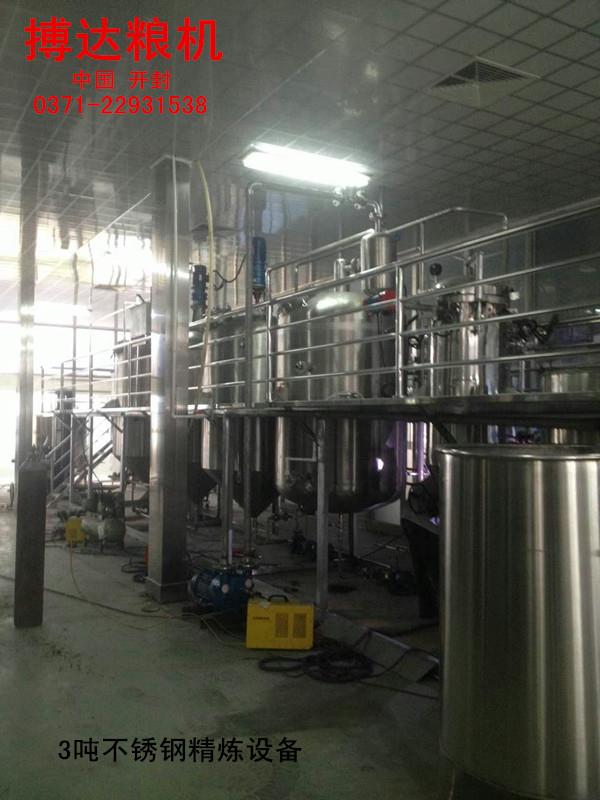 大豆油精煉設(shè)備熱脫皮工藝,今年來,大豆油熱脫皮工藝得到較快的發(fā)展和推廣,大豆油熱脫皮紅衣的形式很多,經(jīng)過處理后的大豆直接進(jìn)入流化床加熱干燥,使表面溫度達(dá)到75-92攝氏度,大豆所含水分9%左右,這主要是為了加熱大豆皮和表層,皮松脆易于裂開。然后由輥破碎機(jī)將大豆對(duì)半破開分為兩瓣,并落入撞擊機(jī)利用撞擊機(jī)作用使豆皮從仁粒上松脫下來,經(jīng)吸風(fēng)分離器進(jìn)行脫皮分離,經(jīng)部分脫皮的半粒狀大豆再經(jīng)過齒輥破碎機(jī)破碎成符合軋坯要求的粒度,而后又經(jīng)撞擊機(jī)和多級(jí)撞擊和多級(jí)吸風(fēng)分離器進(jìn)行第二次脫皮分離,分離出的豆仁至下道工序,豆皮收集后送至豆皮倉庫,該工藝與冷脫皮工藝相比周期短,短時(shí)間的高溫處理減少了大豆油中油脂的變質(zhì)和蛋白質(zhì)的變性。熱大豆破碎后的粉末度減小,這將更有利于皮仁的分離,減少皮中的含仁量。經(jīng)脫皮后的熱豆粒可直接進(jìn)行軋坯,或?yàn)榧訜彳浕笤偃ボ埮鳎@將大大降低生產(chǎn)過程中的蒸汽消耗。